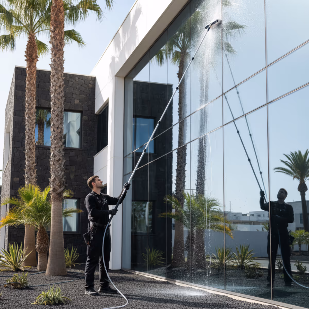 Utilizamos agua desmineralizada (0 ppm de TDS) con pértiga telescópica. Este método elimina cal, salitre y calima sin dejar residuos ni marcas. El agua pura se evapora completamente dejando un acabado perfecto. Ideal para Lanzarote, alcanza hasta 13